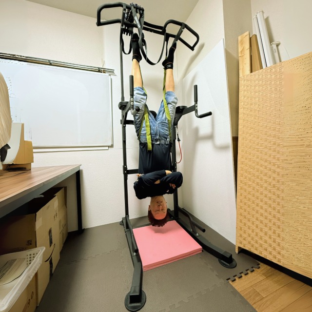 そこで、“懸垂マシン逆さま健康法”を開発しました(笑)